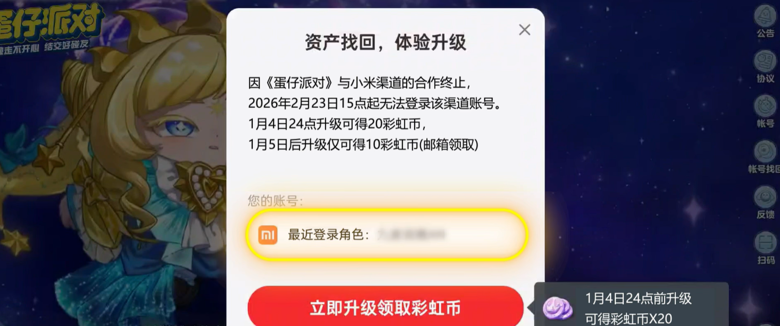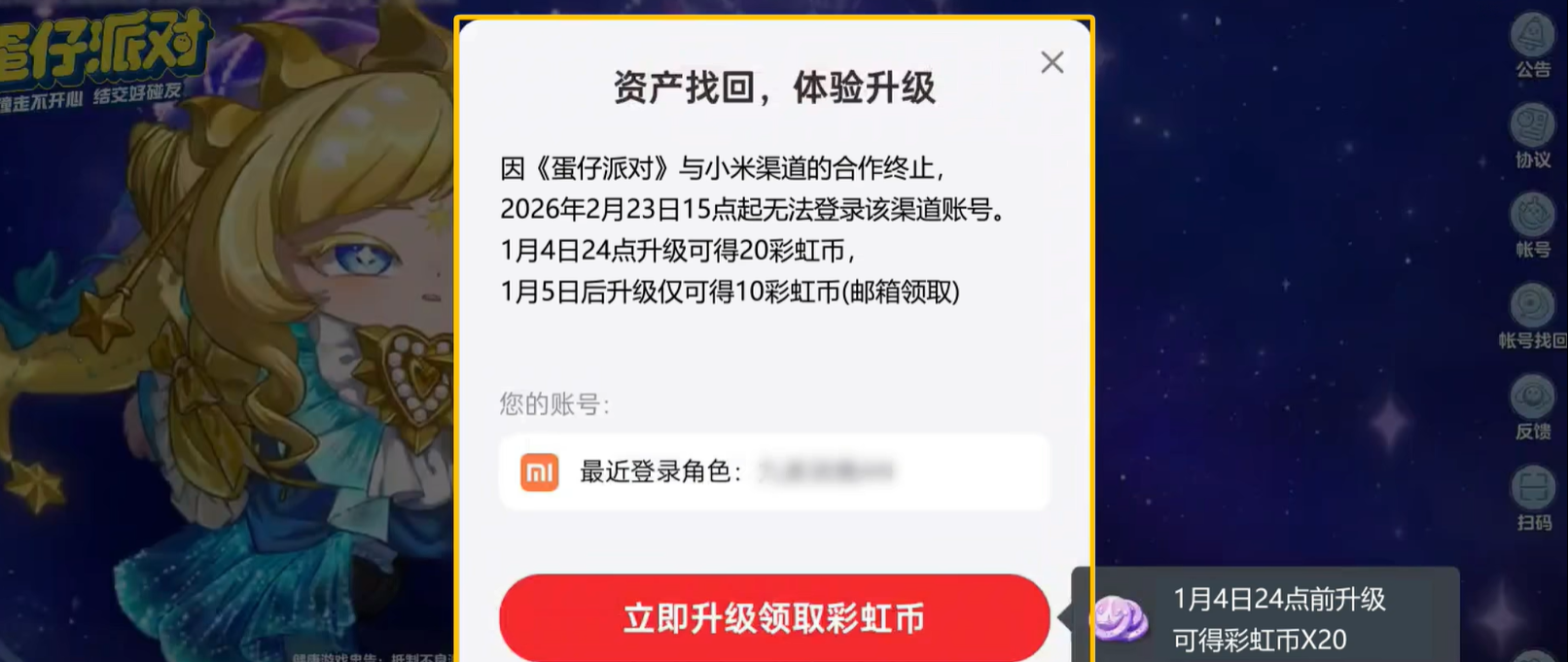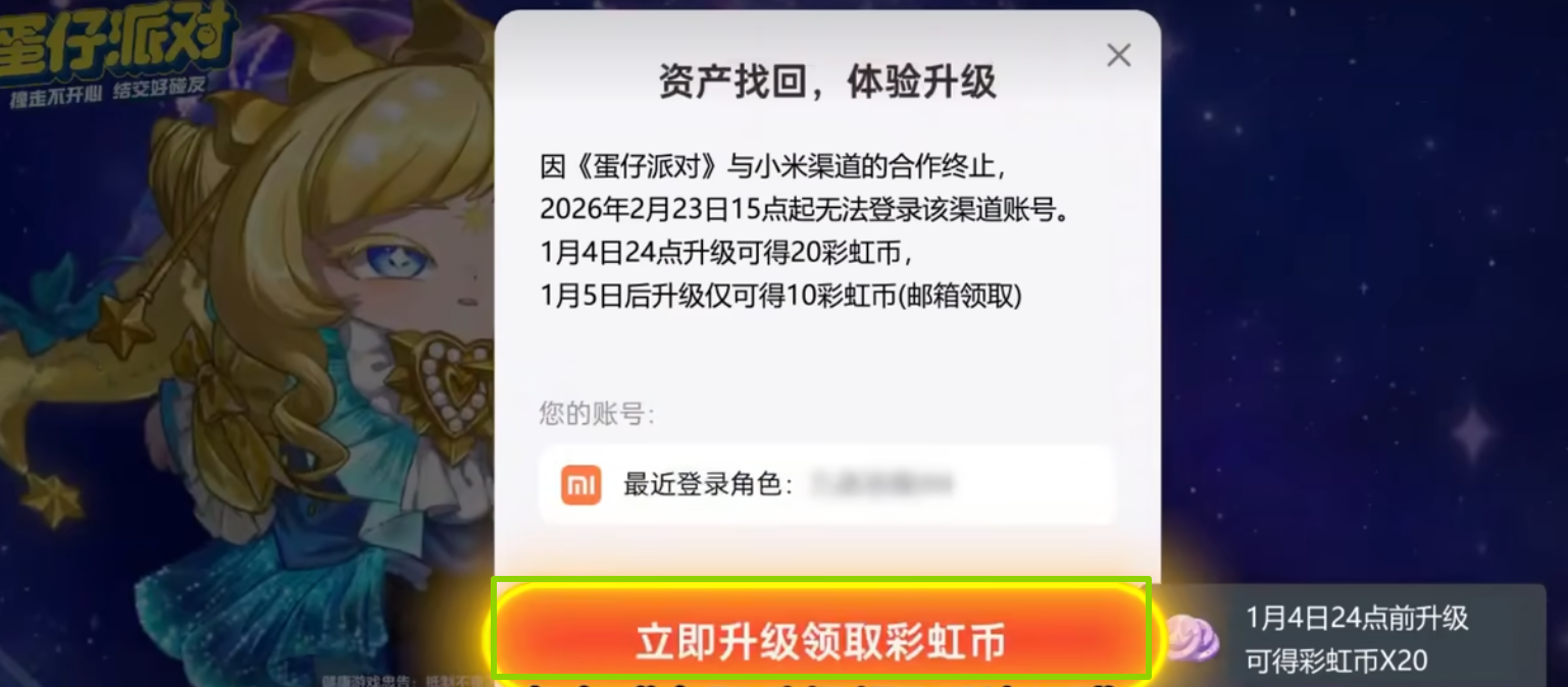 亲爱的蛋仔,由于与小米渠道合作运营策略的调整,《蛋仔派对》小米渠道版本手机游戏将于2026年02月23日15时在小米平台终止运营,现将相关事项通知如下:2025年12月22日10时:关闭游戏在小米平台的下载入口,玩家将无法下载游戏,同时停止游戏充值、新用户注册;2026年02月23日15时:正式停止游戏在小米平台的运营,玩家将无法通过小米端口登录游戏。为保证您游戏体验的完整性,我们将同步开启资产找回服务。在角色资产找回后,即可使用网易账号体验游戏,所有角色信息不变。越早找回资产可获得的奖励越多,渠道停运后您的资产可能会丢失,请尽快找回!